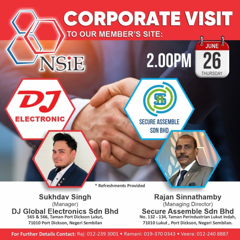 NSiE Corporate Visit is done by voluntarily host of the NSiE members whointend to expose and promote their businesses among the other members. Thisevent is participated by members of NSiE and their invited guests. Towards the end of the visit, refreshments are served by the host.